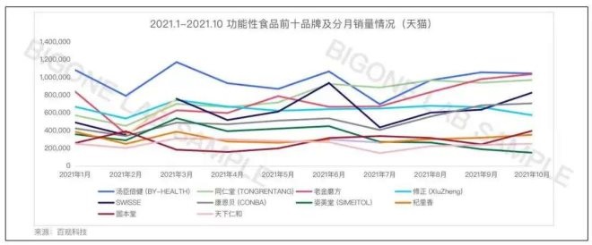 據(jù)公開信息不完全統(tǒng)計,2021年發(fā)生在該賽道的融資事件有12件起,背后有紅杉、GGV紀源資本、IDG資本等頭部機構加持。而根據(jù)百觀科技提供的數(shù)據(jù),去年1-10月天貓功能性食品品牌銷量TOP10中,未見一家資本熱捧的從線上起盤的新品牌身影。