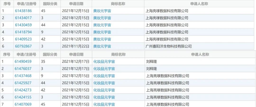 化妝品觀察在中國商標網(wǎng)輸入“化妝品元宇宙”“美妝元宇宙”等字眼,顯示已有15個商標正在申請中,且申請時間均是2021年11月之后。申請人包括護膚品牌韓斐(HANFY)的母公司廣州喜陽洋生物科技有限公司、上海亮嗲數(shù)據(jù)科技有限公司,以及個人劉釋隆,正在申請中的商標包括3類、9類、21類、42類、44類、45類等。