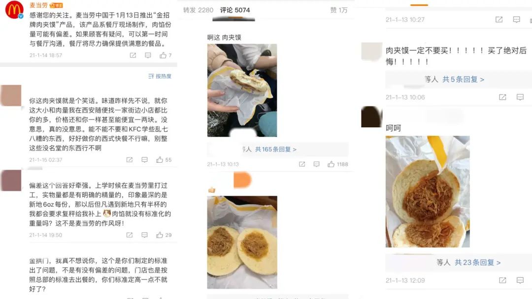 另一方面,消費(fèi)者選擇變多,在肯德基和麥當(dāng)勞用餐也不再有儀式感。頻繁地出新,消費(fèi)者審美疲勞的同時(shí),也沒(méi)少抱怨。2021年麥當(dāng)勞最受爭(zhēng)議的新品就是1月推出的肉夾饃,有網(wǎng)友稱,廣告圖片里是滿滿的肉,但實(shí)物里的肉“薄得像一層醬”。