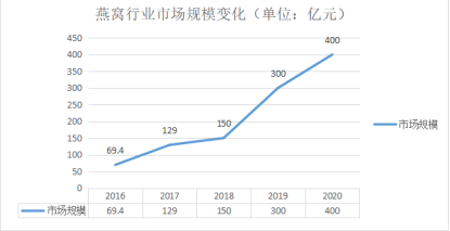 根據(jù)《2020年燕窩行業(yè)白皮書》公布的數(shù)據(jù)顯示,2020年中國燕窩消費市場規(guī)模達到400億元左右,而八年前我國燕窩市場規(guī)模僅為60億元,年復(fù)合增長率達到了33%。