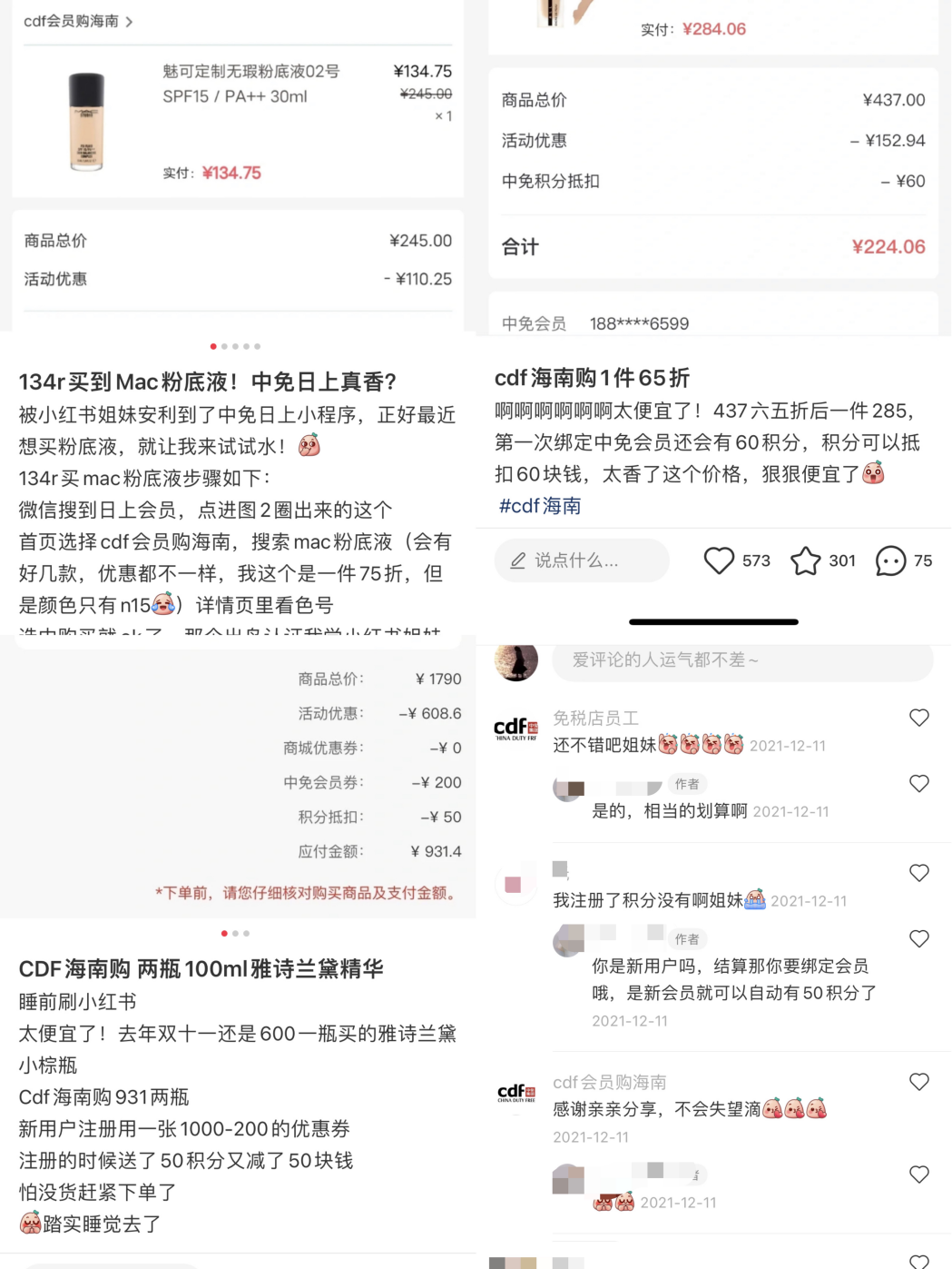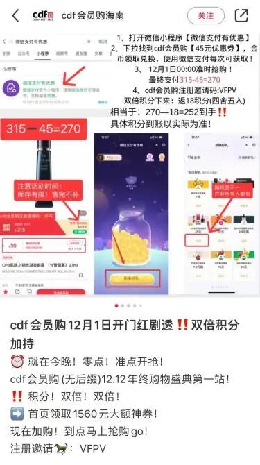 消費(fèi)者一邊吐槽像進(jìn)了“營銷號”的窩,一邊被引流進(jìn)入中免會員購的微信私域。有的消費(fèi)者通過社群和小程序成功購買之后,又會在小紅書種草給其他用戶,出現(xiàn)“人傳人”現(xiàn)象,一番又一番。