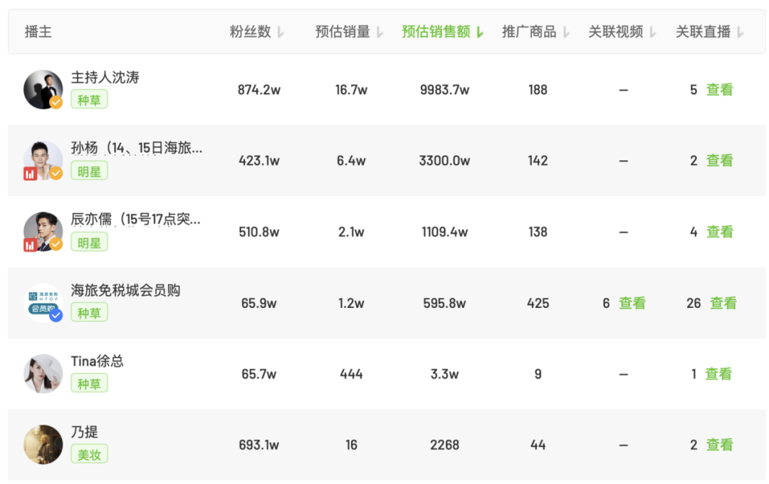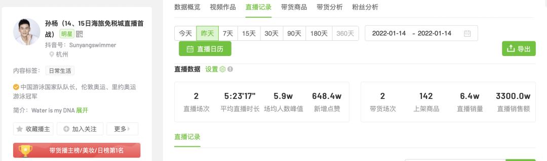 在孫楊之前,主持人沈濤也曾為海旅免稅美妝帶貨。飛瓜數(shù)據(jù)顯示,沈濤曾5次帶貨海旅美妝,其中1月7日專場,直播10個小時,預(yù)計銷售額4394.1萬。孫楊14日的海旅免稅城專場,直播10個小時,預(yù)計銷售額3300萬。