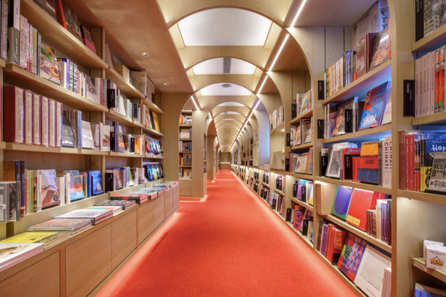 一樓以“磨練知性”為主題,陳列了大量的文學(xué)類書籍。為與建筑的歷史底蘊(yùn)相得益彰,店內(nèi)完整保護(hù)并展現(xiàn)了原有建筑中的壁爐、柯林斯柱等特色部分,呈現(xiàn)極具古典建筑美學(xué)的空間。與一樓濃厚的歷史氛圍相比,二樓則以“收獲感性”為主題,網(wǎng)羅世界各地藝術(shù)書籍的藝術(shù)長廊營造了一個充滿現(xiàn)代感的空間。