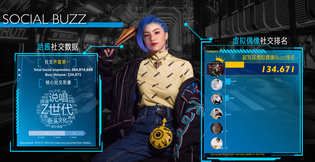 單眼皮、厚嘴唇、藍(lán)色頭的哈醬,定位是偶像化打造的嘻哈歌手。在人物小傳中,她熱愛國(guó)潮穿搭,既熟悉流行音樂,又熱衷于傳統(tǒng)文化。
