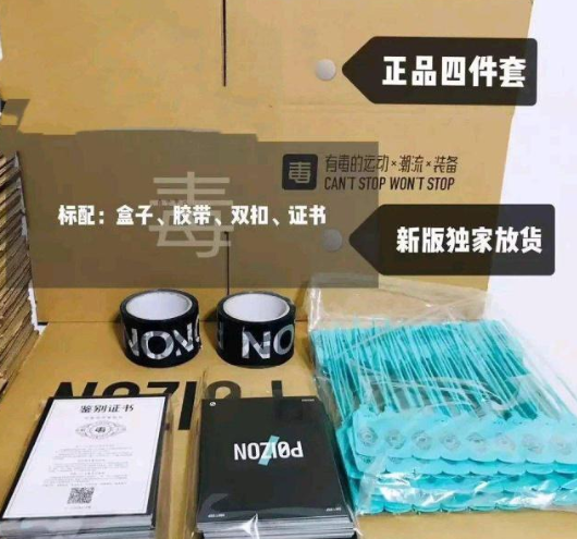 為了解決球鞋市場假貨泛濫的難題,毒采用“先鑒別,后發(fā)貨”的交易模式,其還有一套專屬于自己的鑒定標準,即防偽四件套:得物鑒別證書、認證鞋扣、包裝盒和膠帶,同時擁有四件套的商品被稱為“過毒”,也即鑒定為真。
