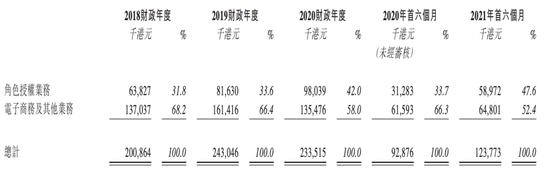 IP授權(quán)收入的急速增長,為德盈控股在疫情下帶來了相對穩(wěn)定的業(yè)績。其在2018-2020財(cái)年的營收分別為2.01億、2.43億、2.34億港元,2021財(cái)年上半年的營收為則為1.24億港元,相較2020財(cái)年同期的0.93億港元增長33.3%,在2020年的增長下降之后,恢復(fù)情況良好。