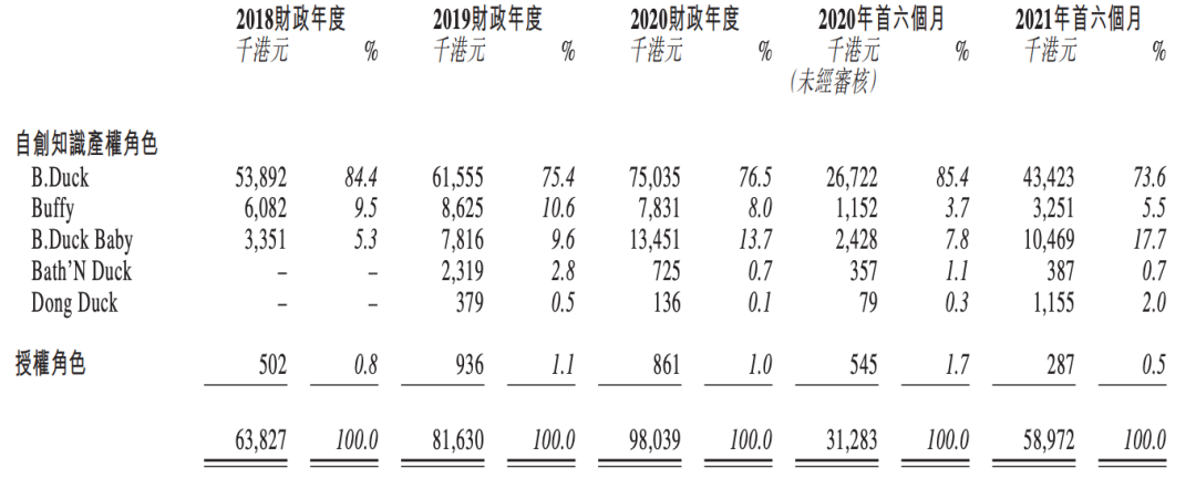 根據(jù)招股書,2018到2020財(cái)年,B.Duck家族占IP授權(quán)業(yè)務(wù)的99.2%、98.9%、99.0%,到2021財(cái)年上半年進(jìn)一步達(dá)到99.5%。而B.Duck家族中,又以B.Duck小黃鴨為核心。