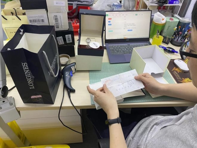分好類的商品會(huì)被分配給鑒定師驗(yàn)真假。壹覽商業(yè)采訪了一位紅布林的腕表鑒定師,并現(xiàn)場(chǎng)演示了鑒定一款浪琴女式腕表!拔覀兡玫轿锲泛,首先要檢查商品所對(duì)應(yīng)的附件,外包裝袋、說明書、?ā⑾嚓P(guān)票據(jù)是否齊全。然后查看保卡上的獨(dú)立編碼與手表上的編碼是否匹配,表扣是否可以正常使用,指針是否處理干凈、表盤字體印刷是否清晰、表帶和后蓋是否有磨損、是否有更換零部件等,然后掃碼錄入物品信息,在系統(tǒng)里進(jìn)行標(biāo)注,就像這款腕表我要勾選輕重拋光(有佩戴痕跡)!