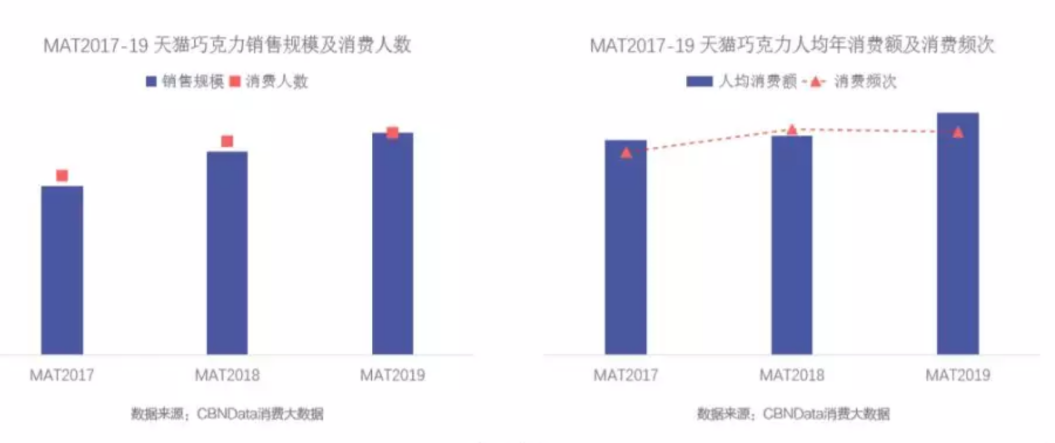 根據(jù)CBNData發(fā)布的《2019年線上甜食消費趨勢》也顯示,2017年至2019年連續(xù)三年的天貓甜食消費數(shù)據(jù)中,巧克力的銷售規(guī)模和消費人數(shù)、人均消費額均處于穩(wěn)定增長,人均消費額持續(xù)增加。