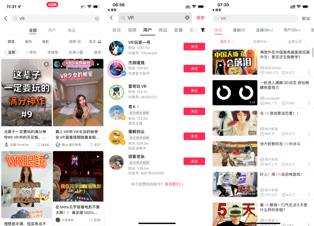 小紅書、抖音、B站中VR部分VR相關(guān)內(nèi)容