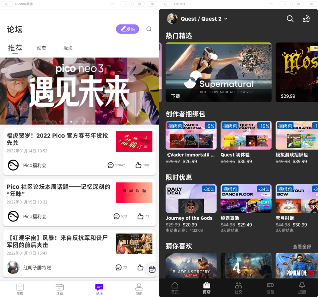 圖注:Pico和Oculus各自App社區(qū)和應(yīng)用市場(chǎng)