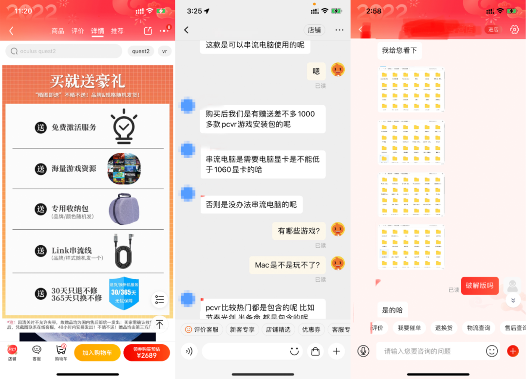 以當(dāng)下最火的Oculus Quest 2為例,其品牌尚未在國(guó)內(nèi)上線,但各線上渠道存在著大量代購(gòu)商家。此外,Oculus受網(wǎng)絡(luò)環(huán)境限制需要“特別設(shè)置”才能使用。第三方商家在銷售的同時(shí),還會(huì)配套提供諸如網(wǎng)絡(luò)設(shè)置、激活設(shè)備、破解版游戲等“增值服務(wù)”,減少消費(fèi)者成為資深玩家的門檻。