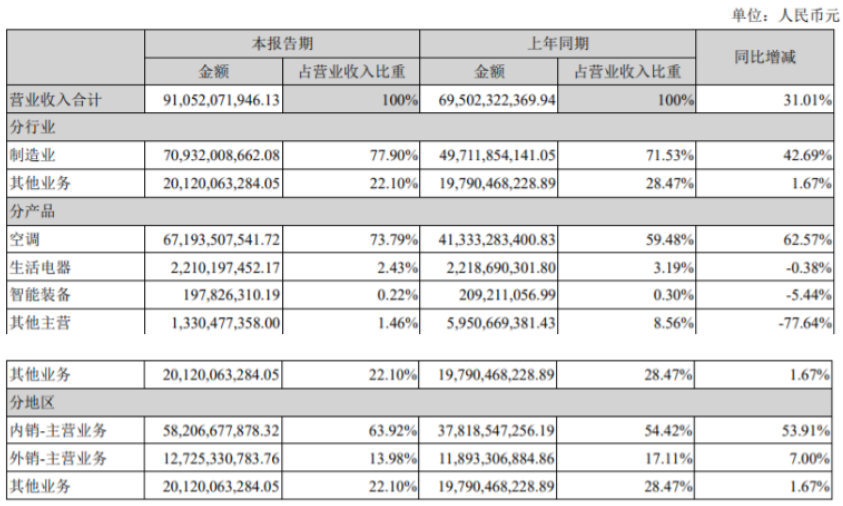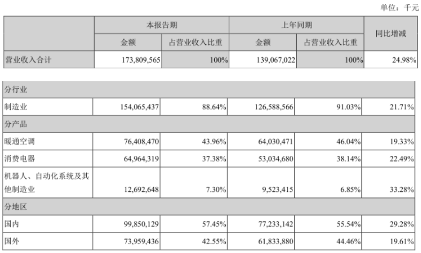 2021年上半年,美的集團(tuán)暖通空調(diào)業(yè)務(wù)實現(xiàn)營業(yè)收入764億元,同比增長19.33%,收入占比為43.96%;消費電器實現(xiàn)營業(yè)收入650億元,同比增長22.4%,收入占比為37.38%;機(jī)器人、自動化系統(tǒng)及其他制造業(yè)營收為127億元,同比增長33.28%,收入占比為7.30%。