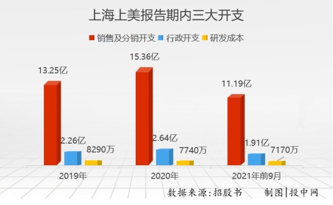 上美的營(yíng)銷費(fèi)用不菲。2019年、2020年及2021年前三季度,銷售及分銷開(kāi)支分別為13.25億元、15.36億元及11.19億元,分別占公司總營(yíng)收的46.1%、45.4%和43.1%。