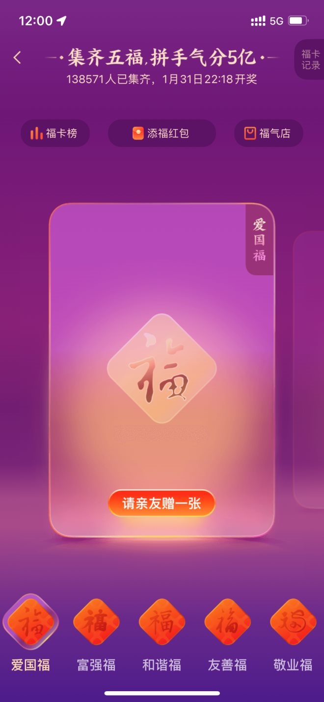 與以往玩法類似,今年集齊五福(和諧福、愛(ài)國(guó)福、富強(qiáng)福、敬業(yè)福和友善福)的用戶將在除夕夜拼手氣共分5億現(xiàn)金紅包。