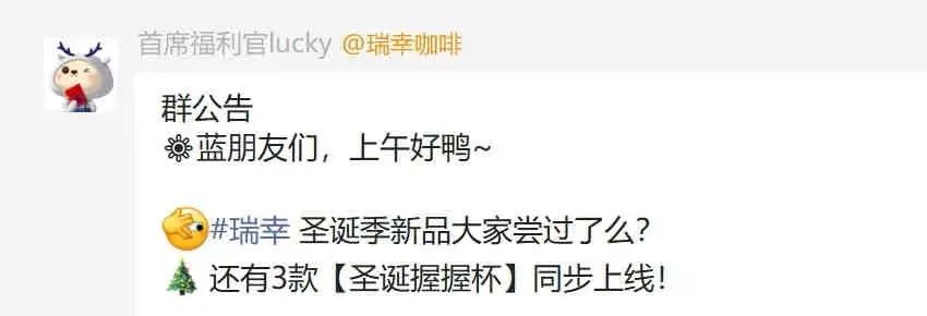尤其在造假事件后,瑞幸社群運(yùn)營人員會根據(jù)用戶的消費(fèi)時間,來設(shè)置群機(jī)器人每天不定期發(fā)福利,推送各種產(chǎn)品優(yōu)惠券給大家。