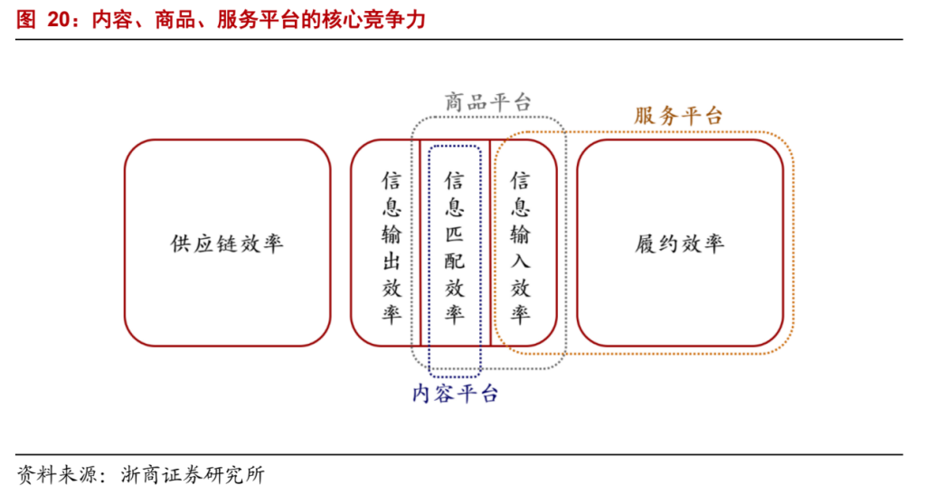 平臺(tái)效率基本可拆分為供應(yīng)鏈效率、信息效率和履約效率。供應(yīng)鏈效率,指的是商品或服務(wù)被生產(chǎn)出來的效率,主要指標(biāo)是生產(chǎn)成本;而信息效率,指的是這里指商品或服務(wù)和消費(fèi)者之間匹配的效率,主要指標(biāo)是匹配準(zhǔn)確度;履約效率,則是將商品或服務(wù)交付給消費(fèi)者的效率,主要指標(biāo)是履約成本。