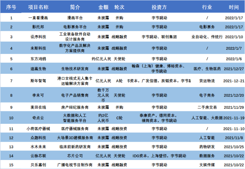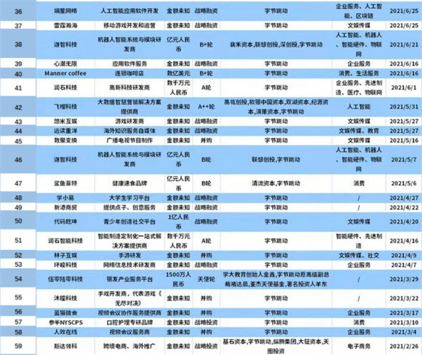 字節(jié)跳動(dòng)2021年在各領(lǐng)域的投資數(shù)量