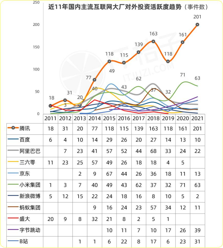 據(jù)IT桔子統(tǒng)計(jì),截至2021年12月24日,小米超過阿里,2021年出手184次;阿里出手次數(shù)僅有78起,但已披露總投資金額比小米高;緊隨其后的是字節(jié)跳動(dòng)、B站、百度、美團(tuán)和京東等。