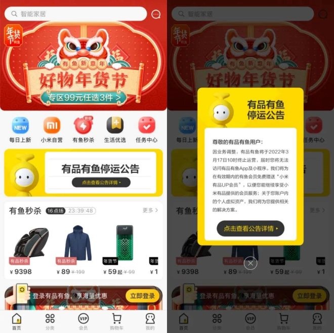 近日,小米旗下新國(guó)貨會(huì)員制電商平臺(tái)“有品有魚”宣布將于2022年3月17日10時(shí)終止運(yùn)營(yíng)。不少用戶短信收到了停運(yùn)的通知,有品有魚App首頁(yè)也發(fā)布了《有品有魚停運(yùn)公告》。