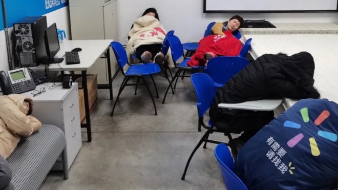 (楊紅霞):我分享的這張照片記錄的是疫情期,我們店數(shù)名同事為了能按時(shí)出勤工作,晚上住在店里的培訓(xùn)室,勉強(qiáng)湊合休息的場(chǎng)景。我們的同事從未有太多的要求。
