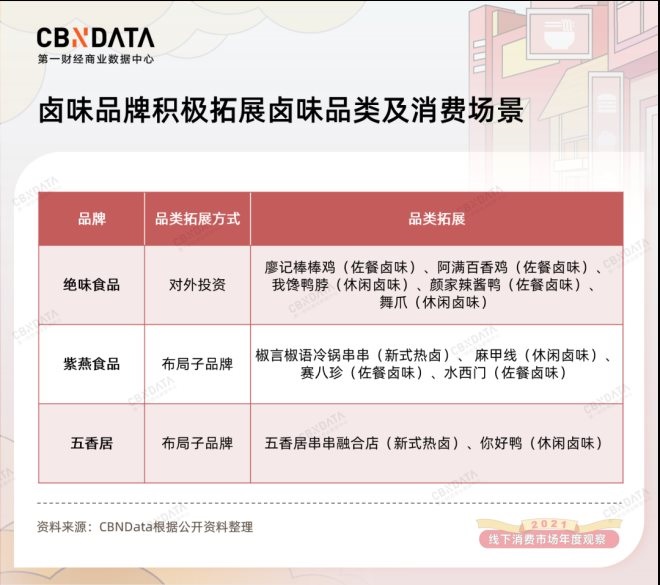除了在主品牌產(chǎn)品端加碼,具備一定實(shí)力的鹵味頭部品牌,還采用布局子品牌、對(duì)外投資等形式,實(shí)現(xiàn)對(duì)佐餐鹵味、休閑鹵味和新式熱鹵的全面覆蓋,搶占盡可能多的鹵味消費(fèi)場(chǎng)景。