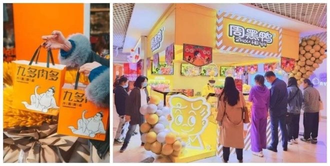除了新品牌,以往畫(huà)風(fēng)“淳樸”的街邊鹵味品牌也開(kāi)始“改頭換面”。河南地方鹵味品牌九多肉多,一改中規(guī)中矩的風(fēng)格,在鄭州年輕人聚集的熱門(mén)商圈開(kāi)出首家年輕化體驗(yàn)店,聘請(qǐng)知名設(shè)計(jì)事務(wù)所進(jìn)行門(mén)店升級(jí),還引入品牌IP九王爺。2021年5月,周黑鴨店面升級(jí)的樣板“小黃店”首店也在上海黃浦區(qū)日月光商場(chǎng)開(kāi)門(mén)營(yíng)業(yè)。門(mén)店設(shè)計(jì)采取年輕人喜歡的波普風(fēng)格,并將品牌的擬人化 LOGO進(jìn)行醒目展現(xiàn)。