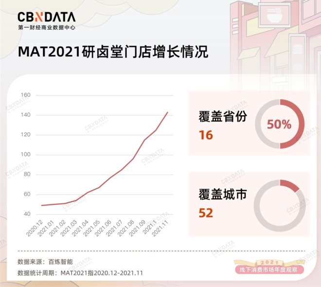 鹵味在產(chǎn)品層面“回歸”鮮鹵熱鹵,即是對(duì)消費(fèi)者需求升級(jí)的迎合,也意味著鮮鹵熱鹵在供應(yīng)鏈管理、產(chǎn)品標(biāo)準(zhǔn)化方面已經(jīng)成熟。而供應(yīng)鏈基礎(chǔ)的完備,助力新式熱鹵品牌激進(jìn)擴(kuò)張。以研鹵堂為例,2021年,研鹵堂門(mén)店數(shù)量增長(zhǎng)近2倍,在地域拓展上完成對(duì)16個(gè)省份、52座城市的覆蓋。分別成立于2019年、2020年的熱鹵食光、鹵虎將,均在2021年實(shí)現(xiàn)門(mén)店的4倍增長(zhǎng)。