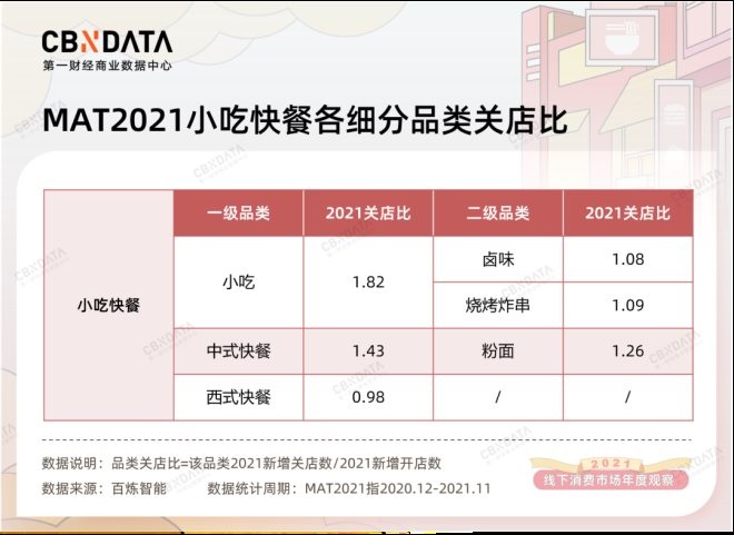 CBNData“2021線下消費(fèi)市場(chǎng)年度觀察”相關(guān)數(shù)據(jù)也顯示,在線下消費(fèi)業(yè)態(tài)中表現(xiàn)最為樂(lè)觀的餐飲業(yè),快餐小吃等“小店”業(yè)態(tài)尤其發(fā)揮主導(dǎo)作用,驅(qū)動(dòng)行業(yè)持續(xù)煥發(fā)生機(jī)。其中,鹵味憑借突出的資本熱度,更龐大的店鋪規(guī)模,以及更低的關(guān)店比,成為“小店”業(yè)態(tài)中最具活力的一條賽道。