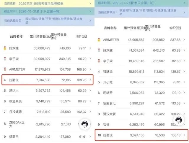 據(jù)悉,拉面說在經(jīng)歷一波快速增長(zhǎng)后,2021年下半年開始經(jīng)歷下滑。在雙11的首輪預(yù)售中,銷售額相比去年接近腰斬,而在速食領(lǐng)域的排名也從去年的第四下降到第十。拉面說把價(jià)格做到了20元+,但在營(yíng)銷之后,也遭遇了口碑下降,復(fù)購難的問題。