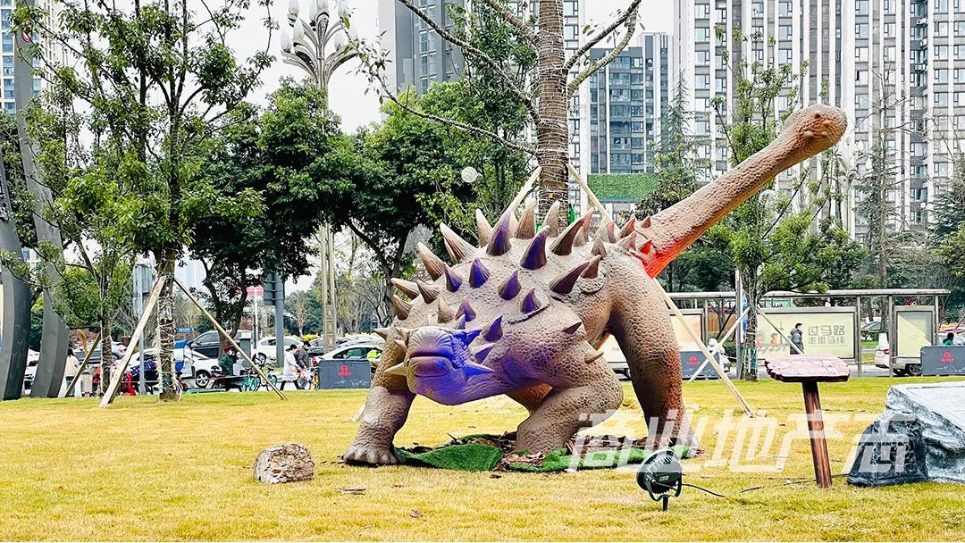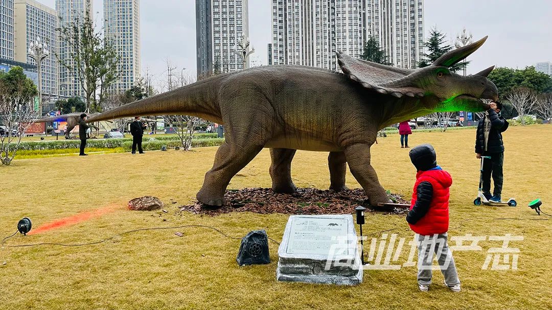 十余種不同類型的電動仿真恐龍模型分布在兩座建筑外側(cè)的草坪廣場上,時不時會擺動頭部或尾巴,既滿足了新鮮好奇、又學(xué)到了不少知識,吸引了很多小朋友和家長駐足圍觀。