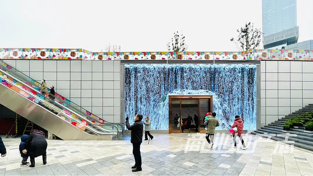 盡管開業(yè)當(dāng)天很冷還下著小雨,但一大早,室外廣場草坪、噴泉便能看到大量的顧客前來拍照打卡,中午和晚上的就餐高峰期,各個餐廳外更是排起長隊。