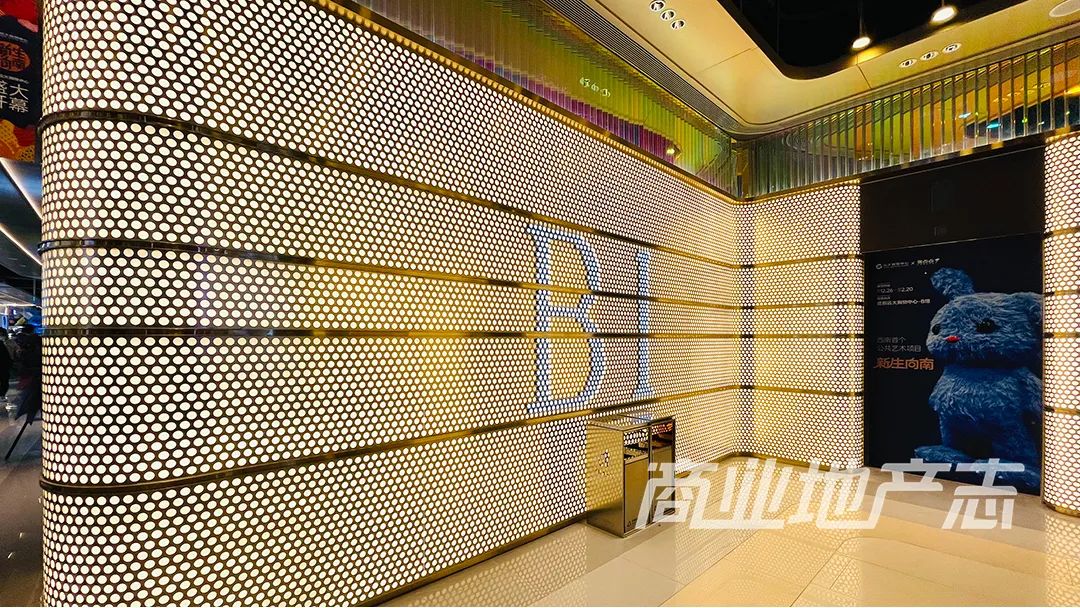 比如,其中一處直梯廳便使用長條蜂窩狀金屬網(wǎng)板進(jìn)行全覆蓋,底層整面墻的光源透出,震撼之余也聽到有顧客現(xiàn)場吐槽說像「KTV大堂的裝修風(fēng)」,看來審美這件事確實見仁見智。