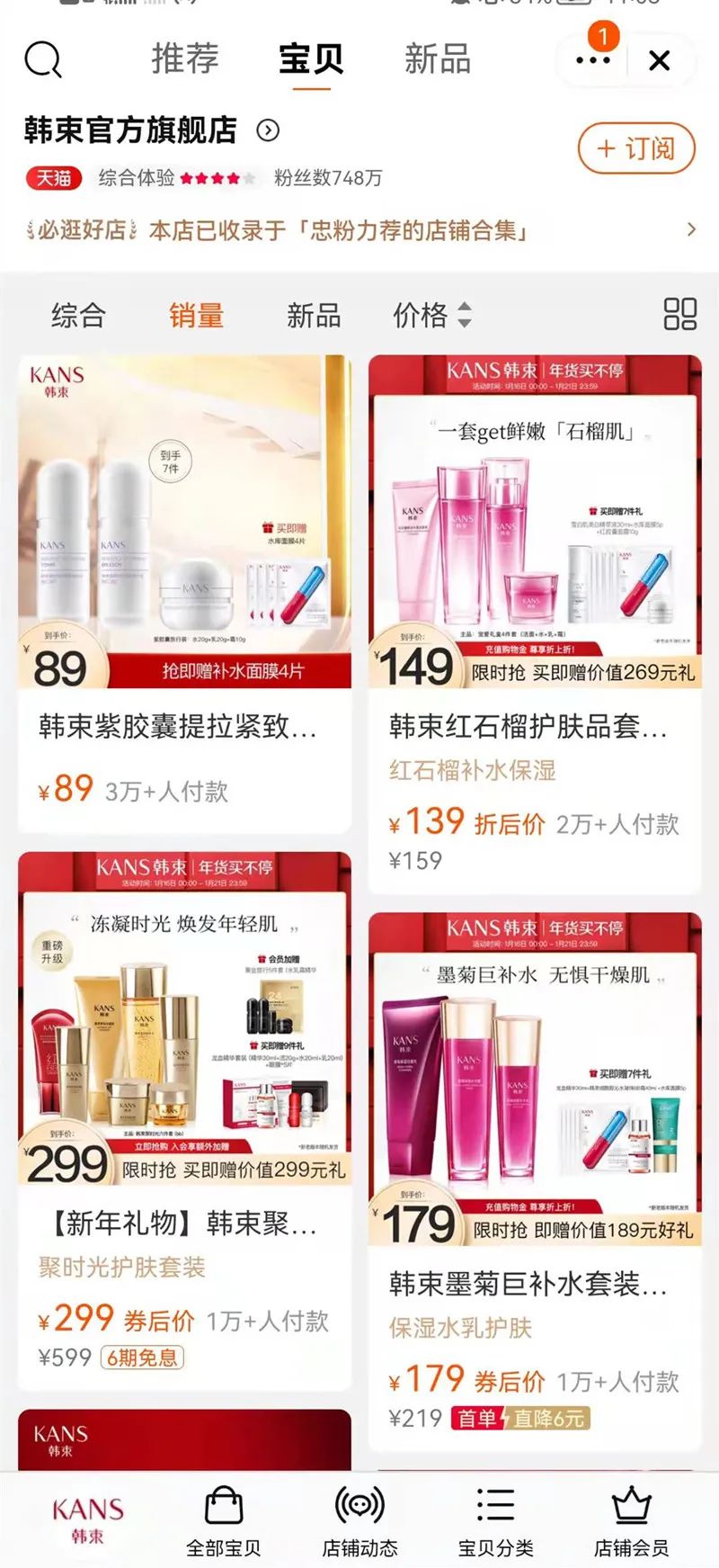 這樣的產(chǎn)品策略代入到行業(yè)可以看出,當下韓束主推的抗老概念雖踩對了市場風口,但整體并未掀起過多水花。在韓束官方淘寶旗艦店中,銷量排名前幾的仍是石榴水、墨菊等早期系列。一葉子面膜在產(chǎn)品推陳出新方面,也略顯乏力。近日新推出和屁桃聯(lián)名的面膜新品,又走了重營銷的老路,借助迪麗熱巴和聯(lián)名的熱度營銷。