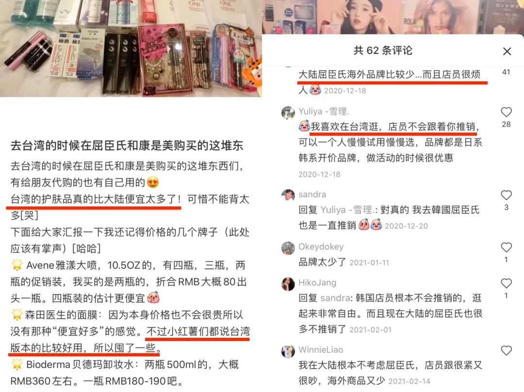 在小紅書、百度貼吧等社交平臺(tái)上,不少網(wǎng)友分享著他們?nèi)ヅ_(tái)灣屈臣氏掃貨、囤貨的攻略清單,這些清單上,同款產(chǎn)品在臺(tái)灣和大陸地區(qū)的價(jià)格相差甚大。