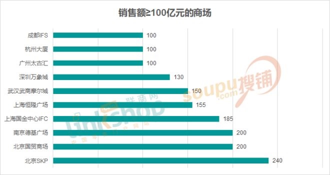 奢侈品市場需求和增長的高企,促進了高端商業(yè)的銷售提升。無一例外,此次統(tǒng)計中的高端商業(yè)同比均取得大幅度增長,諸如上海IFC同比暴漲了68.18%,上海恒隆廣場漲幅超55%...且在銷售額超100億(含100億)的商場中,均為高端商業(yè),相比去年,今年的百億俱樂部也增加至10家。