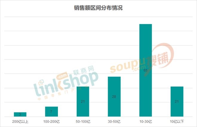 而在各個銷售額區(qū)間中,10億至30億區(qū)間的商場占比最多,共65家,占比約45%;其次是30-50億和50-100億兩個區(qū)間。
