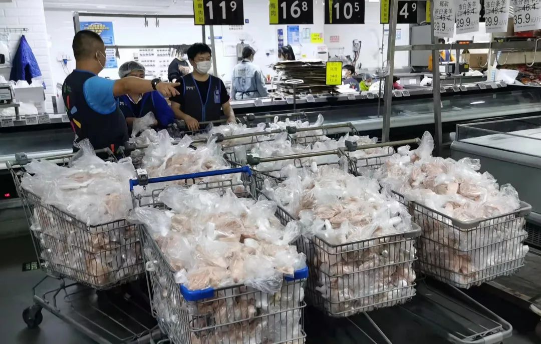 黃寬波說,放進冰袋,可以多保鮮3個小時。因為顧客還要做完核酸,才能領(lǐng)到物資包。我希望顧客拿到我們的肉和物資袋的時候,對疫情的物資供應(yīng)是滿意的。