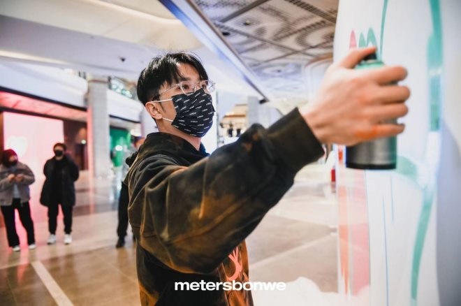 派對現(xiàn)場,為呼應商場所在社區(qū)的原生藝術氛圍,metersbonwe 邀請頂尖涂鴉藝術家——SHEK在店內(nèi)進行即興創(chuàng)作,將現(xiàn)場氛圍推向高潮。
