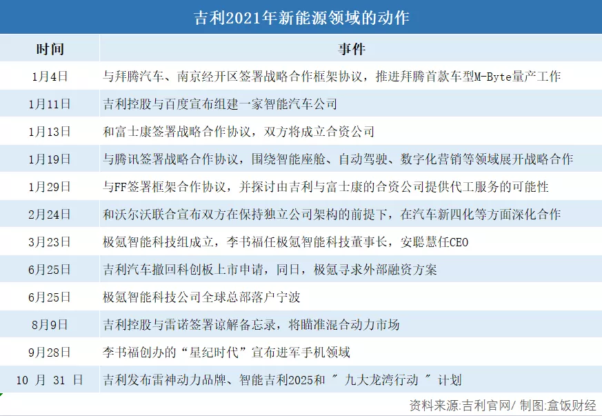 從今年的動(dòng)作來(lái)看,李書(shū)福對(duì)于吉利的轉(zhuǎn)型已經(jīng)迫在眉睫。如在1月份,與騰訊簽署戰(zhàn)略合作協(xié)議,圍繞智能座艙、自動(dòng)駕駛、數(shù)字化營(yíng)銷(xiāo)等領(lǐng)域展開(kāi)戰(zhàn)略合作;10 月份,吉利發(fā)布 " 九大龍灣行動(dòng) " 計(jì)劃, 5年研發(fā)投入1500 億元、2025 年實(shí)現(xiàn)自動(dòng)駕駛?cè)珬W匝幸约?5年內(nèi)推出 25 款以上全新智能新能源產(chǎn)品等。