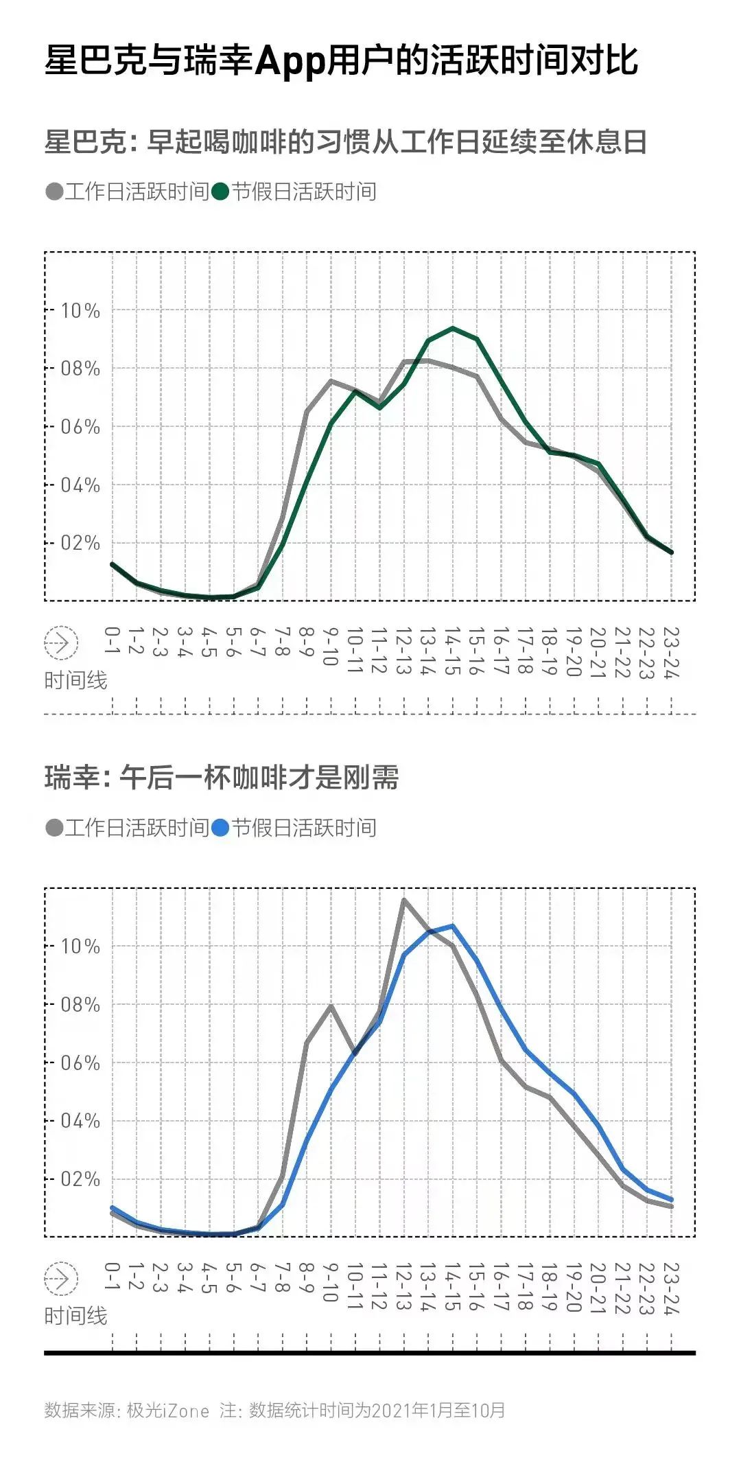 第一財經(jīng)在2021年年末出了一個《中國城市連鎖咖啡報告》,里面提到一個有趣的數(shù)據(jù)對比,星巴克在工作時間是消費高峰,但瑞幸咖啡的消費者往往喜歡午后來一杯,就是說前者的工具屬性更濃,后者的下午茶成分更高,而且年輕人更多。