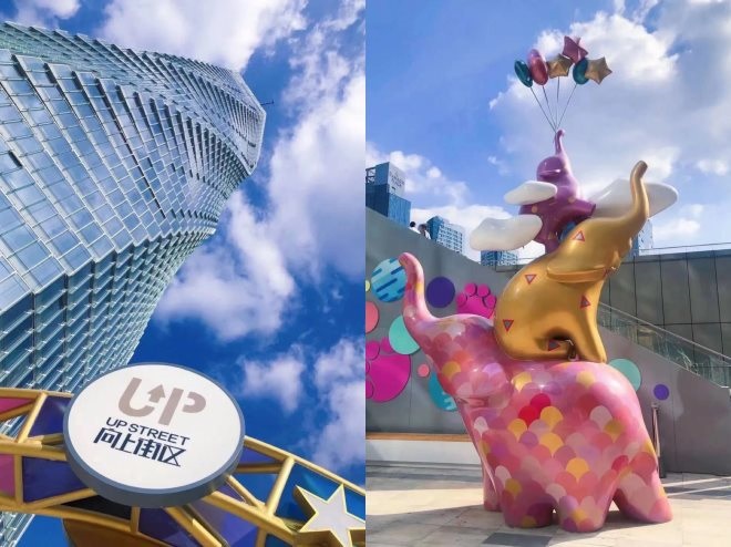 空間上,2021年全新亮相的up street主題街區(qū)充分挖掘了地下空間的商業(yè)價值,從場景到業(yè)態(tài),為城市年輕人帶來了更開放、自由的消費體驗。同時,憑借大象雕塑等有記憶點的美陳和裝置,成為各大網(wǎng)紅打卡地,在小紅書、大眾點評等社交平臺中頻繁曝光。