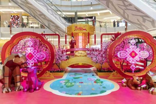 是次商場中庭以雍容華貴的霓燈庭院為靈感,一座高達(dá)4米金碧輝煌的金色六角燈籠矗立其中,雕刻精美的如意橋橫跨于錯(cuò)落別致的庭院中,大紅燈籠張燈結(jié)彩,桃花成林馥郁芬芳,呈現(xiàn)一派繁華盛景。