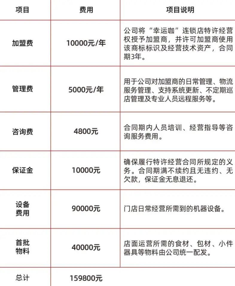據(jù)幸運咖招商工作人員介紹,要開一家幸運咖加盟店,首先需要向品牌方繳納約16萬元的費用,其中包括加盟費1萬元/年、管理費5000元/年,咨詢費4800元、保證金1萬元、設(shè)備費用9萬元、首批物料4萬元;加上店面房租、裝修、人力等費用,總投資預算在30萬元以上。