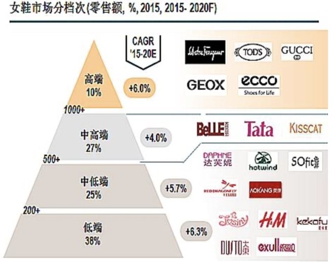 消費者需求的變化導致市場呈啞鈴形增長,消費兩極化趨勢明顯,高端品牌和中低端品牌增速快,而曾經(jīng)主導市場的百麗、達芙妮、紅蜻蜓等中間品牌的銷售額增速輸給了其他檔次的品牌。
