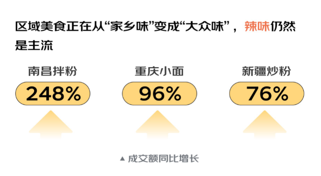 報(bào)告發(fā)現(xiàn),2021年,在食品飲料消費(fèi)領(lǐng)域,方便食品在2019-2021年的復(fù)合增長(zhǎng)率達(dá)到了52%,區(qū)域美食正在從“家鄉(xiāng)味”變成“大眾味”走向全國(guó),花式辣味仍然是主流。2021年,南昌拌粉成交額同比增長(zhǎng)248%,重慶小面成交額同比增長(zhǎng)96%,新疆炒粉成交額同比增長(zhǎng)76%。