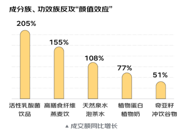 從成交額同比增速來(lái)看,功效、成分“反攻”顏值,活性乳酸菌、燕麥飲等成為增速最快的五大新健康食飲。而低糖低卡食品的增速八強(qiáng)中,最搶眼的是低糖低卡蛋糕,成交額同比提高近6倍。辦公室零食中,超8成職場(chǎng)人吃過(guò)“肉零食”,即食鳳爪以超4倍的增速領(lǐng)跑這一細(xì)分賽道。