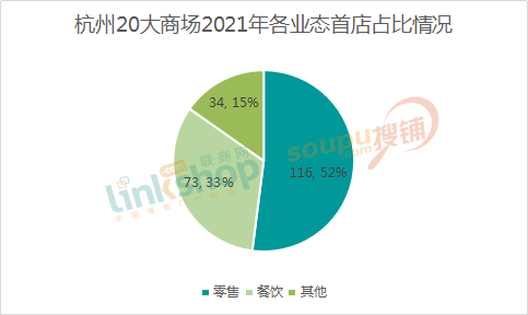 從各業(yè)態(tài)首店情況來看,零售和餐飲首店占大頭,其中零售首店116家,占比52.02%,餐飲首店73家,占比32.73%,其他業(yè)態(tài)的首店合計(jì)也有34家,占比15.25%。