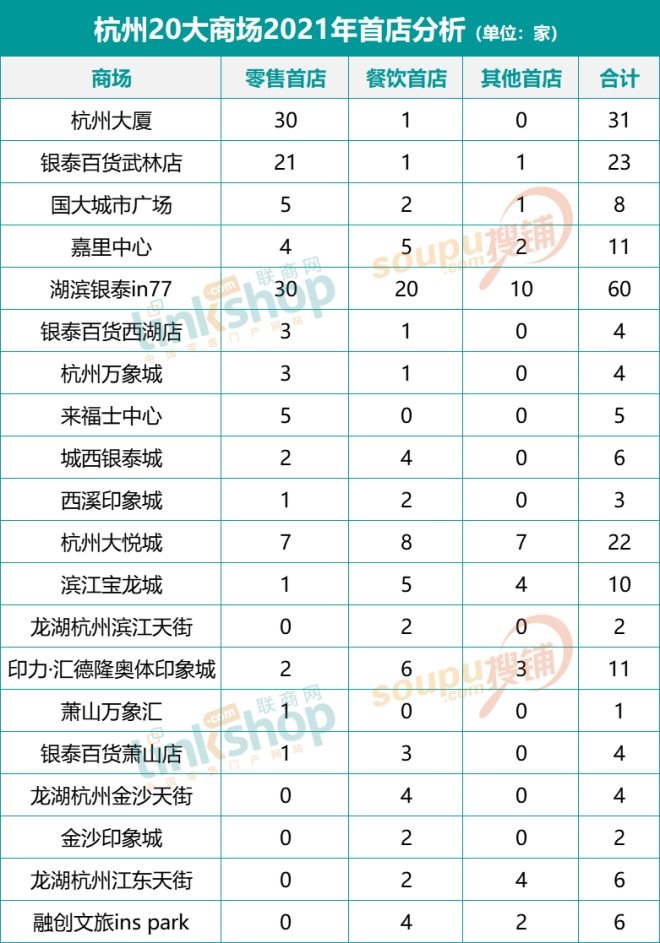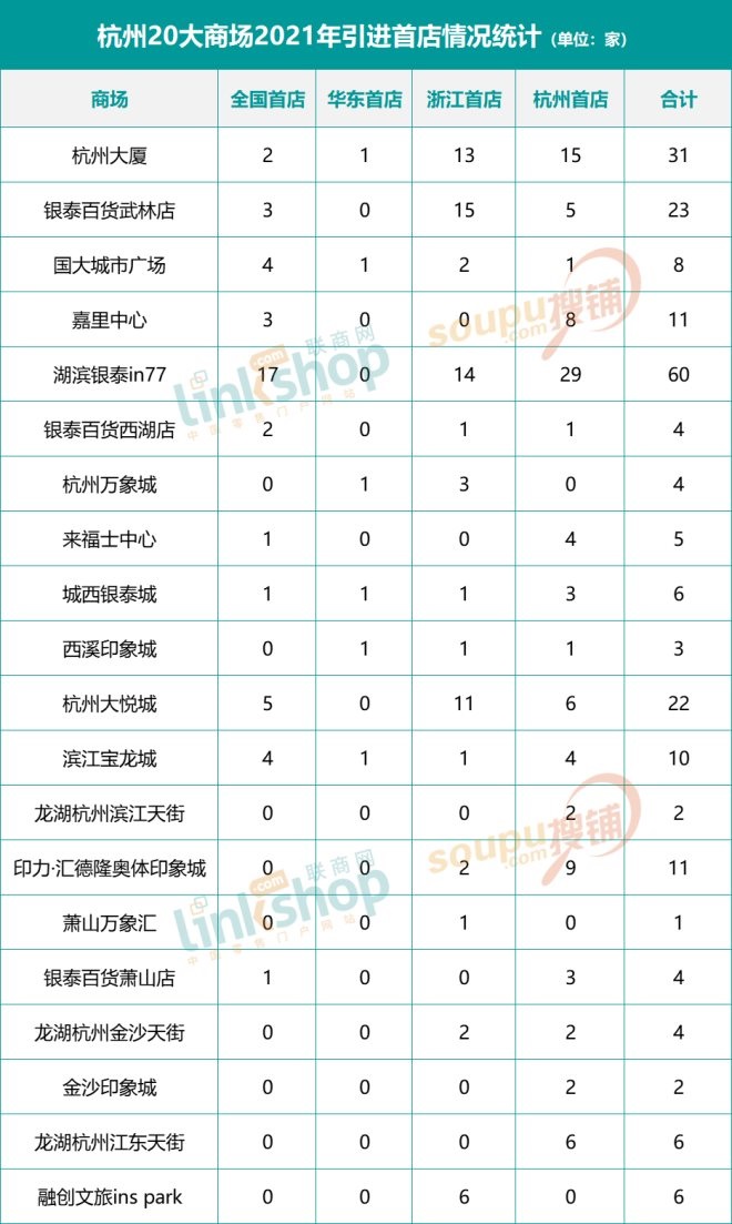 附杭州20大商場(chǎng)2021年首店品牌名單: