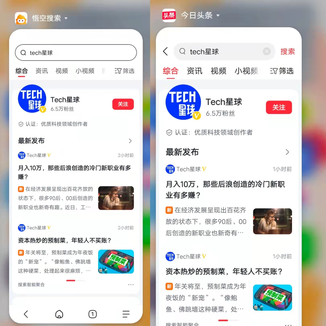 左為頭條搜索界面,右為悟空搜索界面